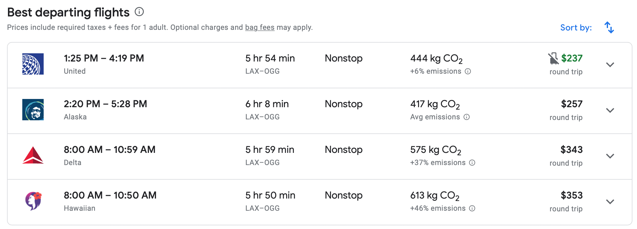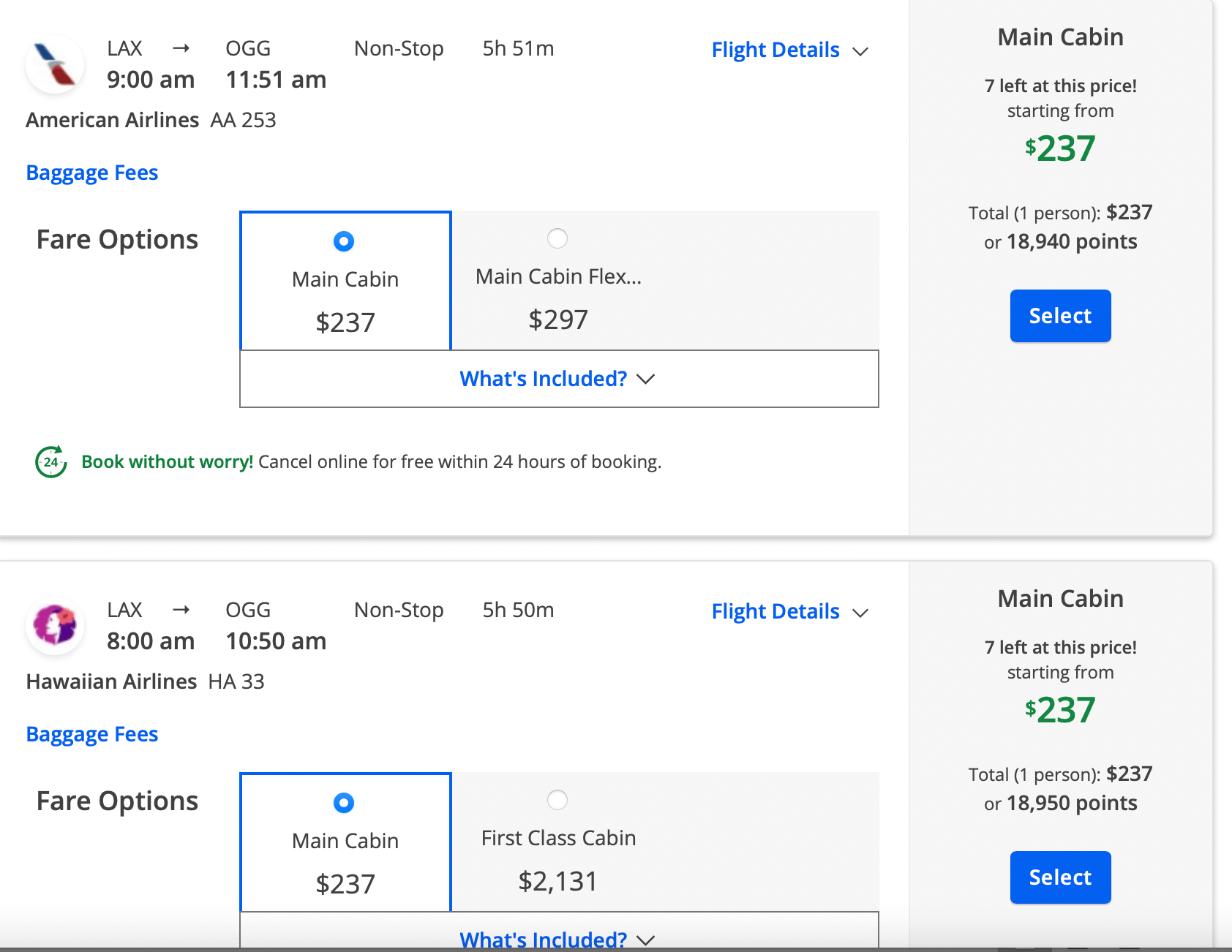 First, I will look at Google Flights to get an idea of cash prices and what airlines can get me from LA to Maui. Google Flights is a great way to find that information quickly. Just remember that Google Flights doesn’t show Southwest, so you’ll want to check their price on their site.