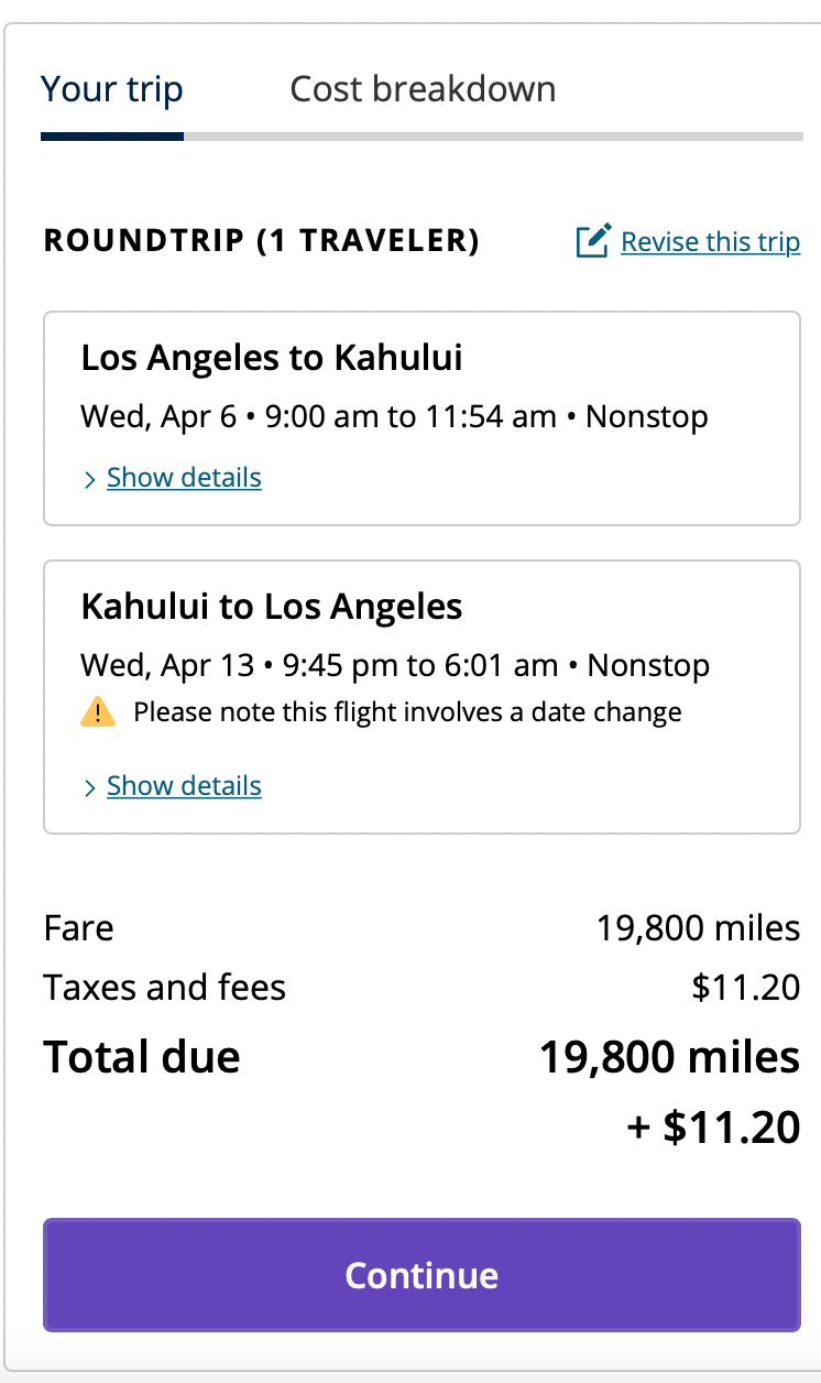 Let’s say that we want to go on a trip to Maui, and we live in Los Angeles. Additionally, let’s say we have 100,000 Chase Ultimate Rewards. We going to go in April before the summer prices jump up.